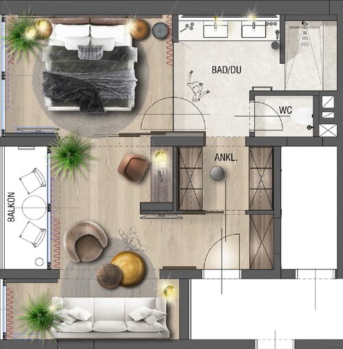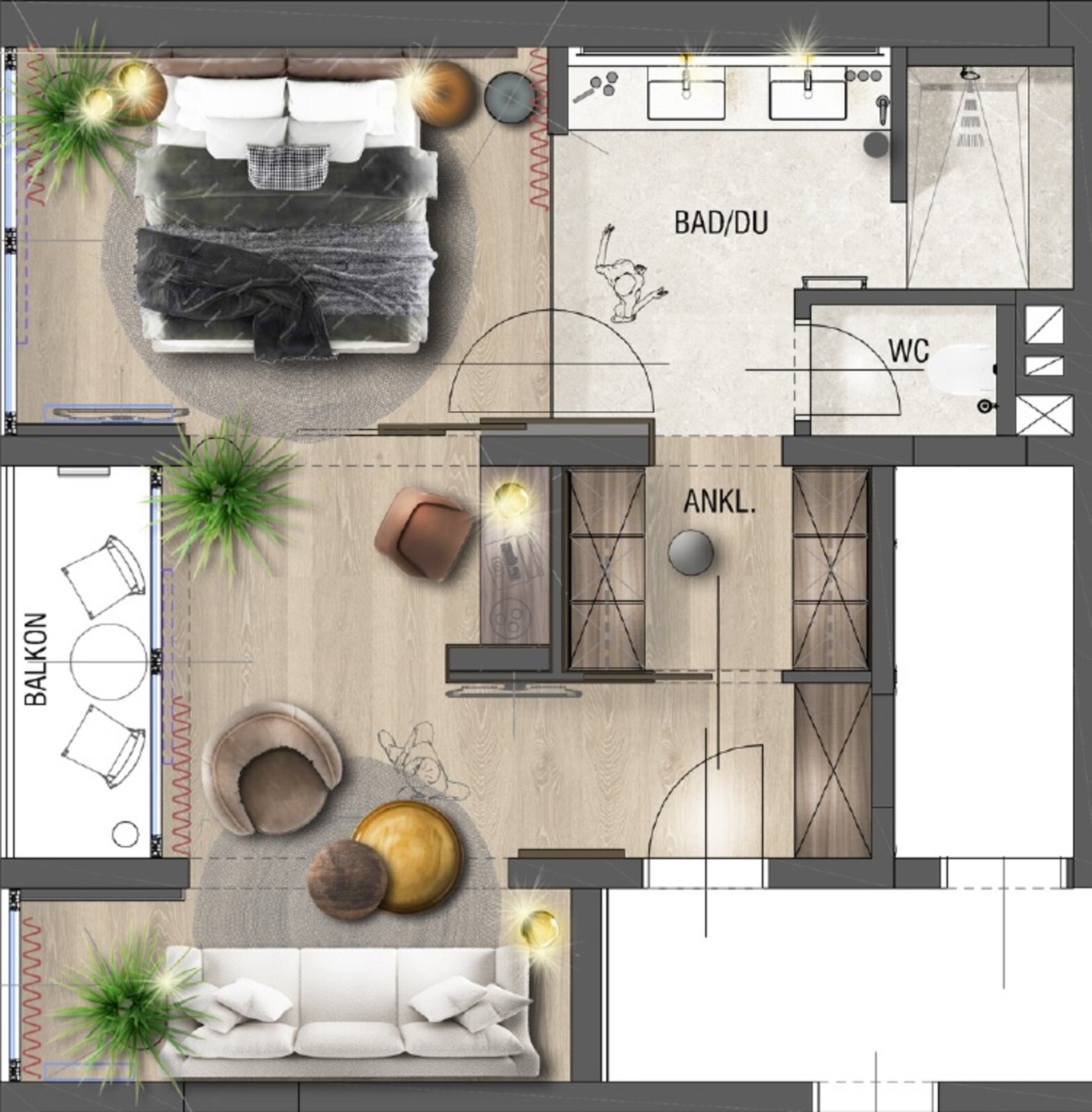 Die Suiten bieten weiteren Komfort mit getrenntem Wohn- und Schlafraum, einem extragroßen Badezimmer mit Tageslicht, Doppelwaschtisch, begehbarer Regendusche, Echtholzparkett und einem geräumigen Ankleidezimmer.